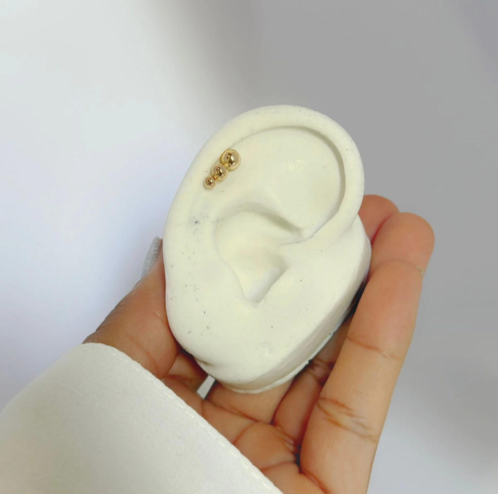 Minimalismo e estilo em um acessório discreto e moderno. Este piercing para tragus apresenta pequenas esferas de design clean, perfeitas para quem busca sofisticação e versatilidade em um detalhe sutil. Seu visual delicado valoriza o contorno da orelha, adicionando charme e personalidade sem exageros.